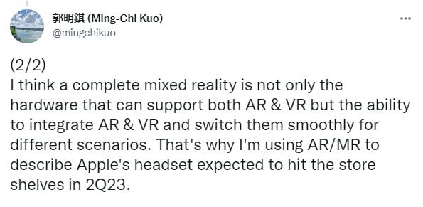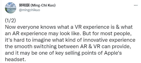 在另一條推文中,郭明錤堅(jiān)稱(chēng),一款完整的MR頭顯“不僅需要具備AR和VR功能,并且還能支持AR/VR模式自如切換。”這也是郭以“AR/MR”來(lái)描述蘋(píng)果頭顯的原因。