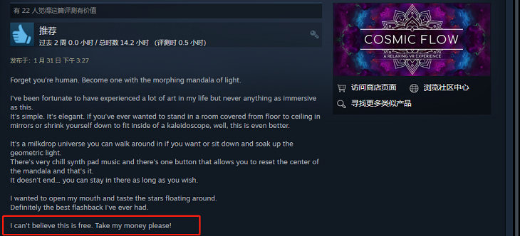 《Cosmic Flow: A Relaxing VR Experience》是Steam上最受好評的一款VR冥想軟件。它利用緩慢變化的萬花筒式畫面配合一些充滿太空感的音樂,以達(dá)到幫助用戶放松的目的。