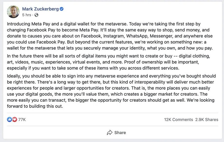 據(jù)CNBC報(bào)道,本周三,Meta宣布「Facebook Pay」更名為「Meta Pay」,扎克伯格稱(chēng)這一改變是Meta創(chuàng)建元宇宙數(shù)字錢(qián)包的“第一步”,并表示「Meta Pay」在未來(lái)一段時(shí)間內(nèi)不會(huì)有太大的變化,用戶仍能通過(guò)該應(yīng)用與Facebook、Instagram、WhatsApp的朋友和家人進(jìn)行經(jīng)濟(jì)來(lái)往,以及支付購(gòu)物及捐贈(zèng)。