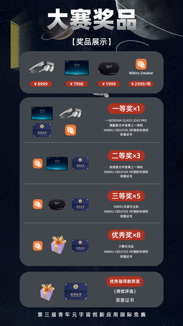 本次大賽共設立一等獎1名、二等獎3名、三等獎5名、優(yōu)秀獎8名以及優(yōu)秀指導教師獎若干名,獎品總價值超10萬元人民幣。獎品包含:Dream Glass Lead Pro、旗艦版元宇宙掌上一體機、Nibiru Creator軟件以及其他獎品。