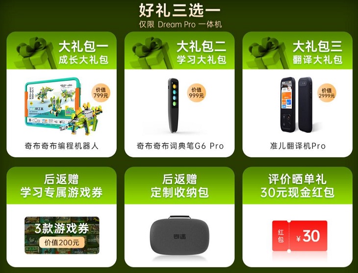 針對不同學齡的學生黨的學習和娛樂所需,奇遇VR為9歲以下(小學及以下)學齡段人群贈送價值799元的“成長大禮包”,包含奇布奇布編程機器人一臺、奇遇收納包一個及專屬游戲券200元;10歲-15歲(小學&初衷)學齡者為價值999元的“學習大禮包”,包含奇布奇布詞典筆G6 Pro一個、奇遇收納包一個及專屬游戲券200元;16歲以上(高中及以上)學齡贈送價值2999元“翻譯大禮包”,包含翻譯機一臺、奇遇收納包一個及專屬游戲券200元。