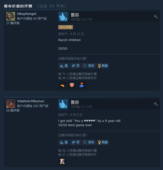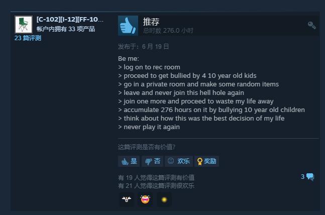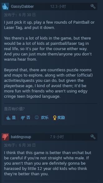 TheVerge在2021年3月的報(bào)道中寫(xiě)到,Rec Room創(chuàng)始人Nick Fajt聲稱該平臺(tái)的主要用戶是13至16歲的青少年。這本身不是什么奇怪的事,因?yàn)榍嗌倌耆后w正是對(duì)新事物最好奇最愿意去嘗試的群體。但翻一翻Steam平臺(tái)近期的評(píng)論,與未成年用戶相關(guān)的評(píng)論就顯得相當(dāng)精彩了。我們隨意截圖了幾條評(píng)論,里面包含了各式各樣的吐槽。