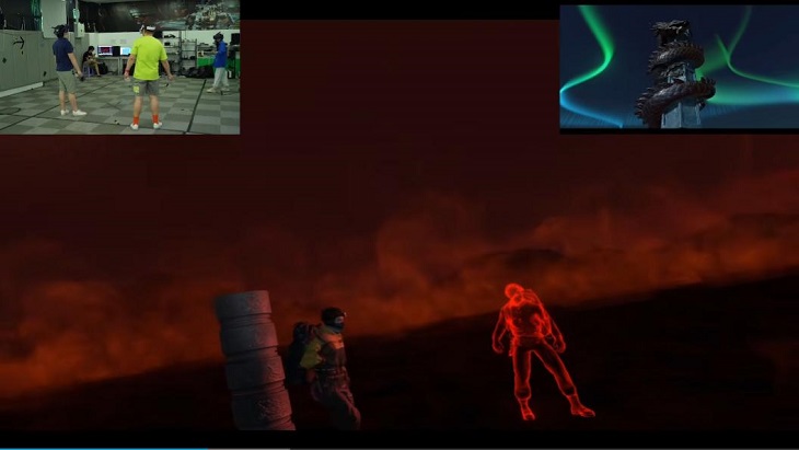 在這款大空間游戲中,我們可以看到沉浸世界設(shè)計(jì)的游戲內(nèi)場景整體大小基本與外部空間大小一致,玩家只要在場景中正常的進(jìn)行活動,不去往未亮起燈光的區(qū)域或是嘗試直接穿過墻壁,就不用擔(dān)心會撞到場地外圍的墻壁上。即使玩家好奇視圖穿過游戲中位于場景中間區(qū)域的墻壁,游戲畫面也會灰下來不顯示任何墻壁后的畫面,防止因?yàn)槲锢泶┠?dǎo)致的劇透問題。