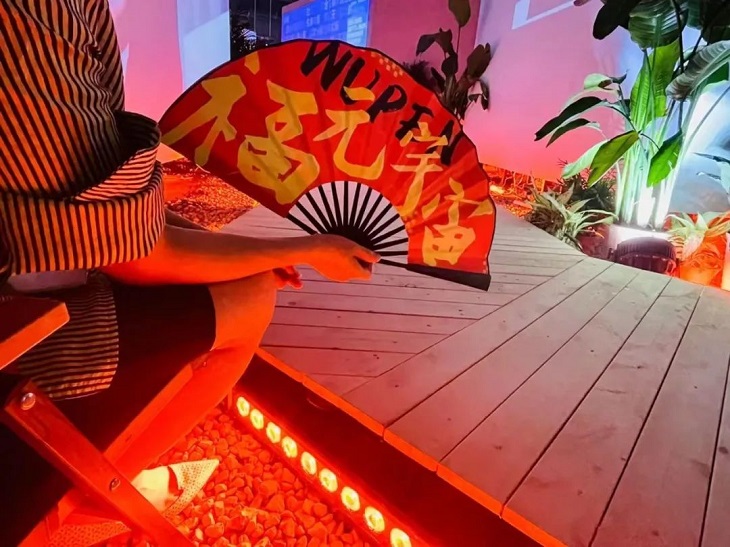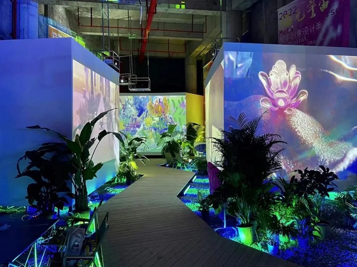 7月19日,記者穿過青年會(huì)廣場(chǎng),走進(jìn)“福元宇宙”展館。夜幕下,只見館內(nèi)光影效果變換,伴隨小路延伸的投影大屏科技感十足。