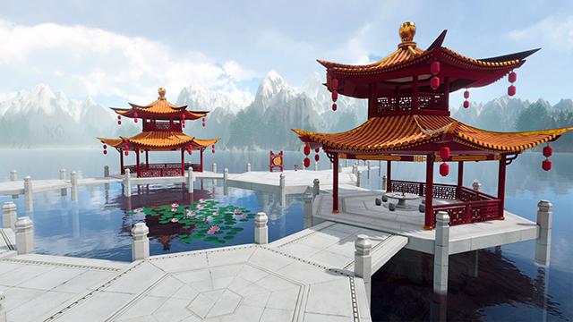 從充斥著飛艇的沙漠峽谷到降落在豪華懸崖房屋頂端籃球場上的四架無人機(jī)、從充滿東方韻味的中國寶塔和石頭行道到長滿植物的山頂瀑布,「Many Worlds VR」里各類新穎的事物都在等待玩家的發(fā)掘。