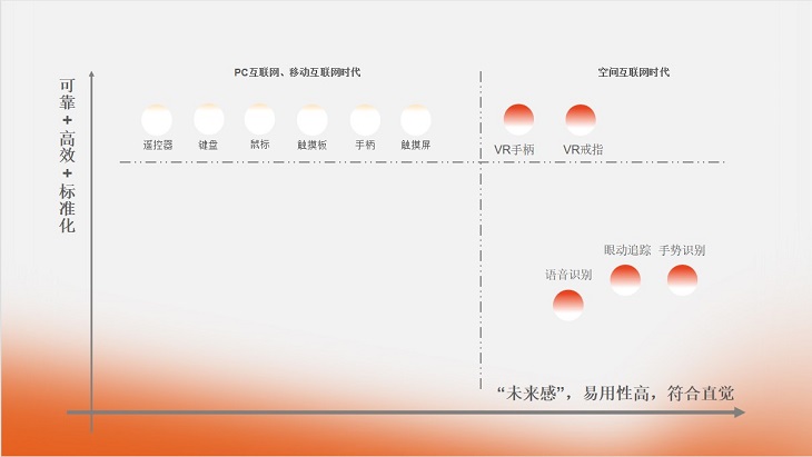 張道寧先生在大會上提出:“易用性與普及特征有一定的矛盾性,只有你跳出它的規(guī)律曲線,兼顧易用性和高效性時,這個產(chǎn)品才能真正得到普及,比如PC時代的鼠標鍵盤,移動互聯(lián)網(wǎng)時代的觸摸屏,以及VR里NOLO即將發(fā)布的VR交互小戒指。但同時,未來的交互是多樣化的,以控制器為“基石”方式,多樣化交互方式輔助的。