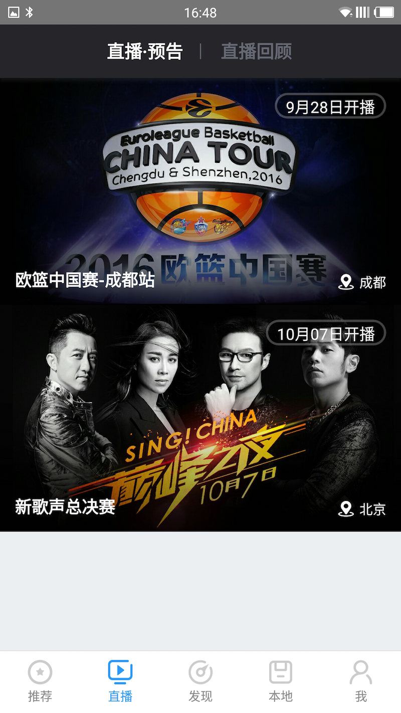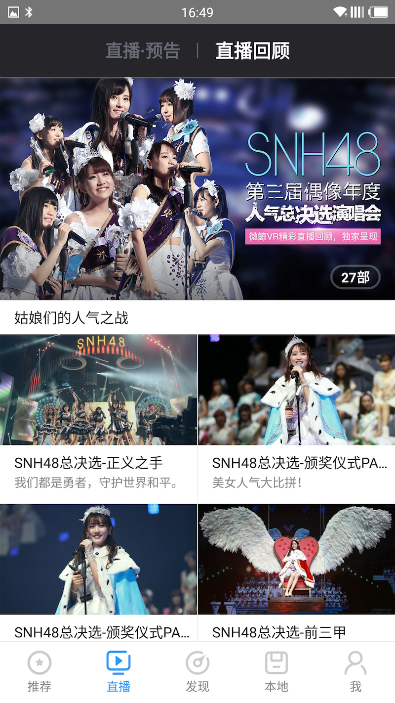 直播一直是微鯨VR的大一特色,所以非常有必要單獨設(shè)置一個版塊。在上一個版本中,直播也是作為一個單獨的大版塊存在的。進入直播版塊,在頁面上方有兩個標(biāo)簽,一個是“直播•預(yù)告”,一個是“直播回顧”。顧名思義,點擊“直播•預(yù)告”標(biāo)簽,你將會看到正在和即將直播的內(nèi)容,點擊另一個標(biāo)簽則會看到已經(jīng)結(jié)束直播的回顧內(nèi)容。在“直播•預(yù)告”頁面,我看到每一部內(nèi)容都顯示了直播的具體時間和地點,這樣對于用戶準(zhǔn)確了解直播時間和及時觀看直播內(nèi)容都提供了便利。
