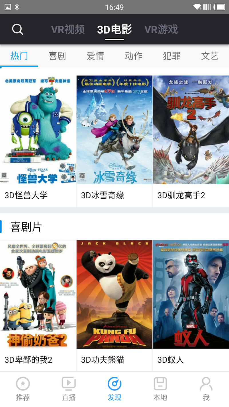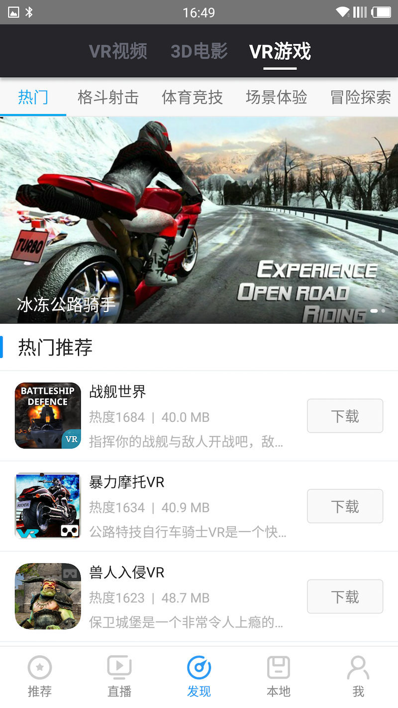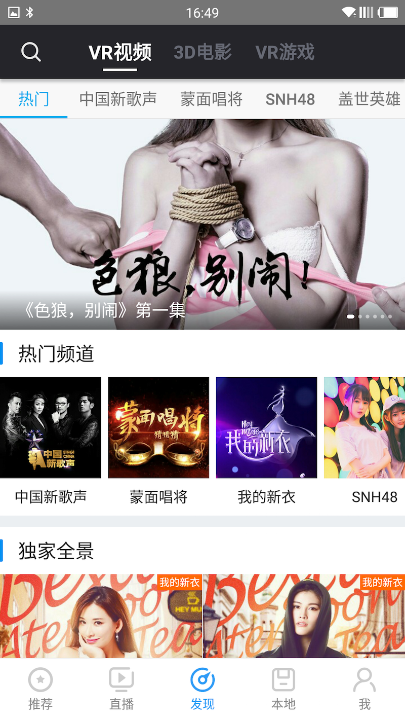 首先,和直播版塊一樣,發(fā)現(xiàn)版塊在頁面上方也提供了標(biāo)簽,將全部內(nèi)容進行了清晰的劃分。頁面上方的三大標(biāo)簽是VR視頻、3D電影和VR游戲,點擊對應(yīng)的標(biāo)簽,你可以看到相應(yīng)的內(nèi)容。