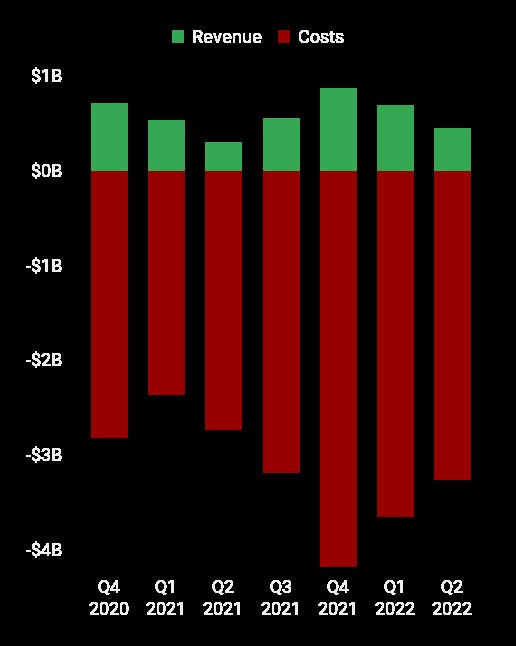 2022年第二季度Meta Reality Labs營收4.52億美元,高于2021年第二季度的3.05億美元,但該部門成本高達(dá)33億美元,高于2021年第一季度的27億美元,結(jié)果部門虧損28億美元,高于2021年第一季度的24億美元。