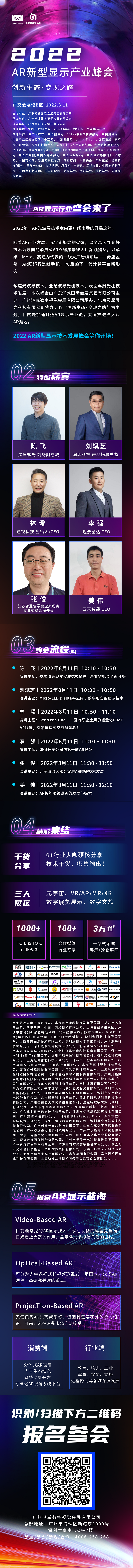 聚焦光波導技術(shù)、全息波導光柵技術(shù)、表面浮雕光柵技術(shù)發(fā)展以及AR新型顯示產(chǎn)業(yè)商務(wù)配對,本次峰會由廣東鴻威國際會展集團有限公司主辦,廣州鴻威數(shù)字視覺會展有限公司承辦,北京靈犀微光科技有限公司協(xié)辦,以“創(chuàng)新生態(tài)·變現(xiàn)之路”為主題,目的是加速打通AR顯示產(chǎn)業(yè)鏈,共同推進準入及AR落地。