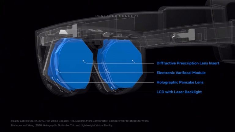 Meta Reality Labs顯示系統(tǒng)研究總監(jiān)Douglas Lanman表示,Mirror Lake將包括電子變焦鏡頭(包括處方校正)、多視點眼動追蹤、全息pancake鏡頭、高級直通、反向直通和類似護目鏡外形的激光背光。