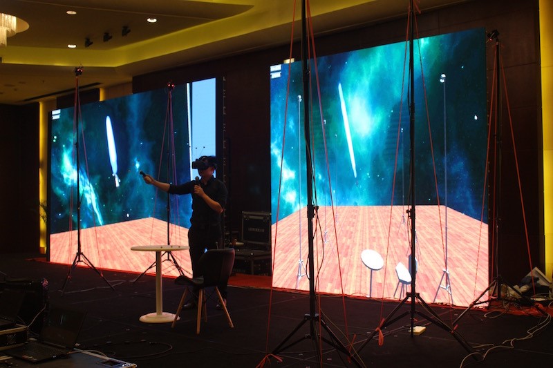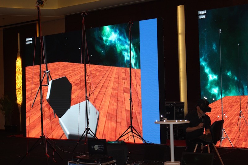 據(jù)介紹現(xiàn)場的空間只有部分舞臺大小的這個環(huán)境,僅僅是利用幾個小時的時間臨時搭建起來的商用虛擬現(xiàn)實環(huán)境,場地面積可以支持到數(shù)百平米至數(shù)千平米,而且在這樣的環(huán)境中可以追蹤多個人和物體。