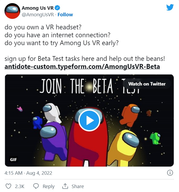 報(bào)名鏈接:antidote-custom.typeform.com/AmongUsVR-Beta
