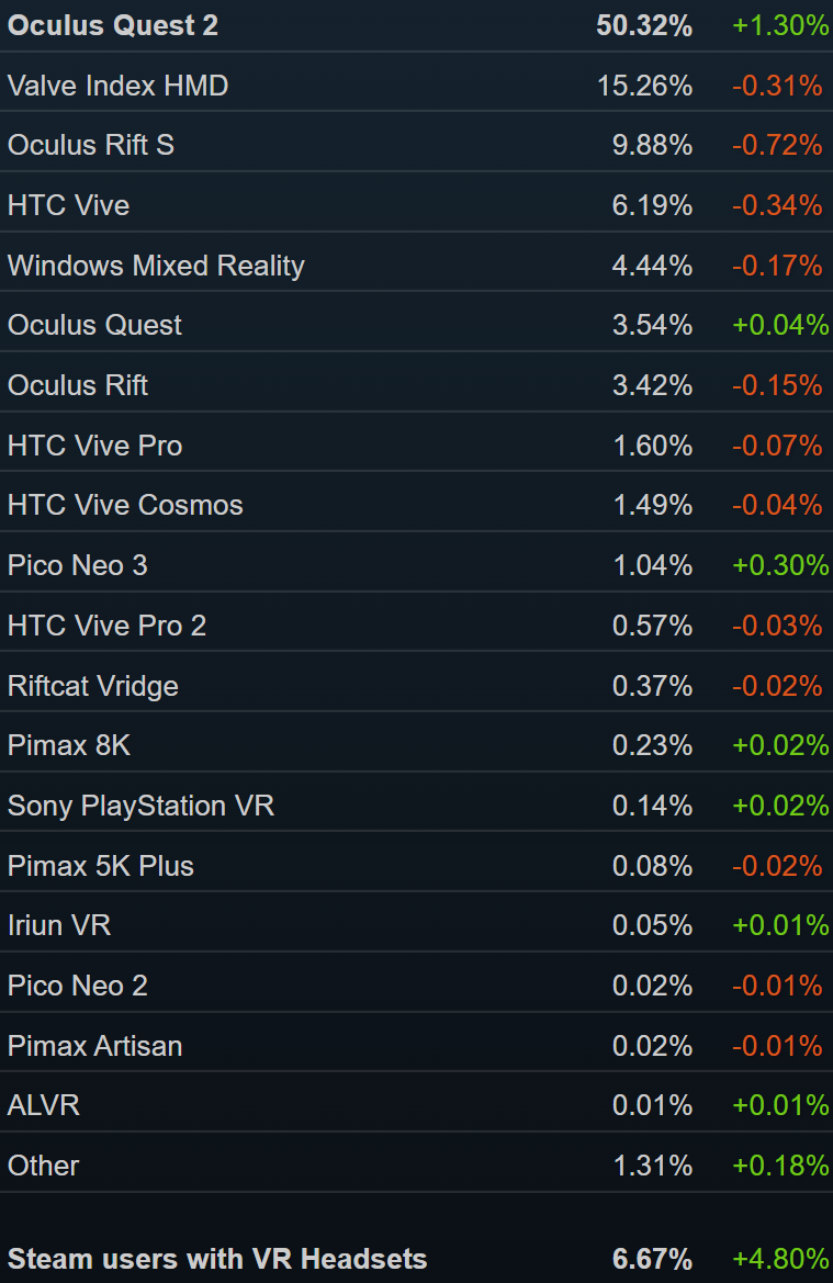 UploadVR篤定,7月SteamVR用戶實(shí)際并沒有翻兩番,因?yàn)闆]有新的主流VR頭顯發(fā)布,Quest 2售價(jià)不降反升,如果是真正的增長(zhǎng),各廠商頭顯占比也會(huì)隨之發(fā)生劇變。