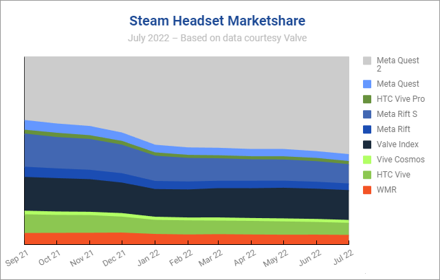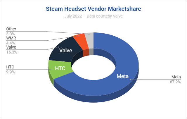 當(dāng)然,Quest 2并不是Steam唯一Meta頭顯,Quest 2、Quest 1、Rift S及Rift在上個(gè)月均略有增長(zhǎng),總體占比達(dá)到67.16% (+0.48%),唯有Rift S受供應(yīng)商整體收益影響,占比下降為9.88%(-0.72%),目前,Meta系頭顯已占據(jù)Steam三分之二以上席位。