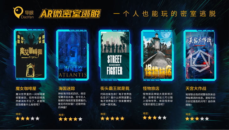 導(dǎo)眼·AR微密室逃脫設(shè)定不同世界觀的游戲背景,目前已運營六大主題,采用實時定位交互技術(shù)和FOV119.5°視場角的AR眼鏡,讓玩家感受不同以往的密室逃脫體驗。5平米的主題小房間、20分鐘左右的游戲時間,主打輕體量和小成本的AR項目能快速落地到商圈、景區(qū)等人流量聚集地。