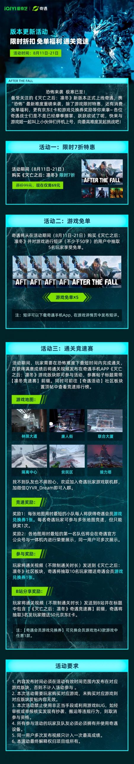 活動(dòng)期間,玩家需要在林蔭大道、貧民區(qū)、接力塔等6個(gè)指定地圖中,以全新“恐怖”難度完成通關(guān),并將通關(guān)視頻發(fā)布至奇遇VR手機(jī)APP《滅亡之后:凜冬》游戲版塊。各地圖用時(shí)最短的小隊(duì)每人將獲得1張奇遇會(huì)員游戲兌換券,用時(shí)最短的隊(duì)伍將會(huì)在奇遇官方公眾號(hào)與一體機(jī)內(nèi)進(jìn)行榮譽(yù)展示。