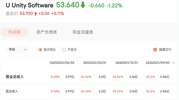 根據(jù)Unity公布的財(cái)報(bào),在統(tǒng)計(jì)截止至 6 月 30 日的三個(gè)月里,公司營收 2.97 億美元,同比上升了 9%。同時(shí),第二季度凈虧損從去年同期的1.48億美元擴(kuò)大到了2.04億美元。上半年凈虧損也從2.55億美元擴(kuò)大到了3.81億美元。
