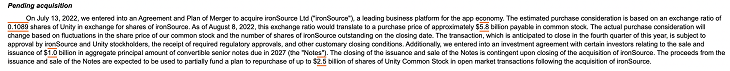 第一件事,7月14日,Unity宣布與企業(yè)級(jí)平臺(tái)ironSource達(dá)成合并。根據(jù)協(xié)議,ironSource 將通過全股票交易合并為 Unity的全資子公司。其中每股ironSource普通股將換取0.1089股Unity普通股。交易完成后,目前 Unity 股東將擁有約73.5%的股份,而 IronSource 現(xiàn)有股東將擁有合并后公司約26.5%的股份。報(bào)道稱,本次合并將于今年第四季度完成。