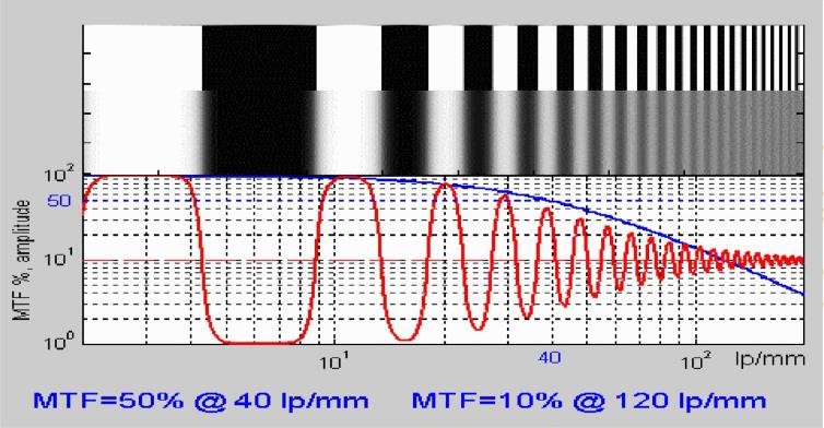 例如上圖中,最上面是一組逐漸變密的黑白測(cè)試線條,中間是一組通過透鏡成像的線條,下圖中紅色曲線代表成像的亮度變化,藍(lán)色曲線則是MTF-lp/mm曲線。