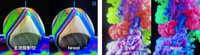 另Nreal AR眼鏡和投影儀、VR眼鏡在同一視頻播放的對(duì)比上,其在色彩絢麗度和清晰度上更勝一籌,整體顯示效果也明顯優(yōu)于其他兩款產(chǎn)品。