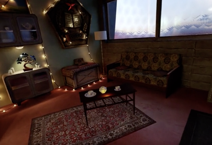 以及房間中貼了玻璃紙的玻璃質(zhì)感和木頭墻面的對(duì)比: