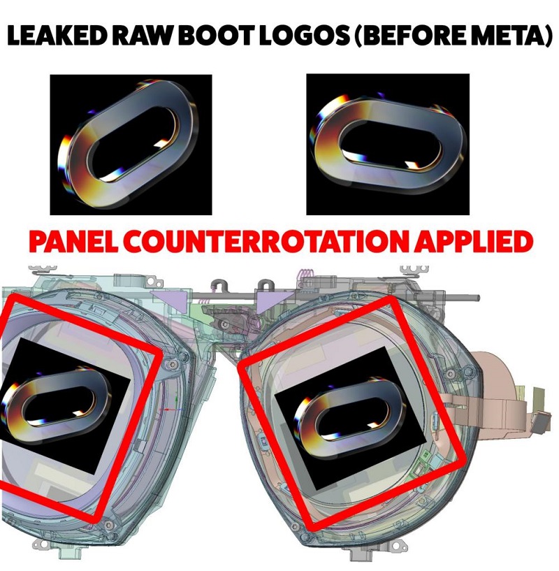 Cambria相比Quest 2最明顯的改變是設(shè)備的體積。Pancake光學(xué)方案讓Cambria變得更為小巧,也帶來了更平衡的重量分配。其中最值得一提的是,Cambria顯示面板的擺放方式,不再是水平放置,而是對(duì)向傾斜21°。這樣一來垂直的可視區(qū)域?qū)⒛軌蛟黾硬簧?。從固件中解包的開機(jī)LOGO畫面也印證了這一點(diǎn)。