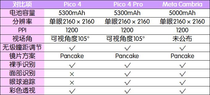 參數(shù)方面,Pico 4與Pico 4 Pro公布的參數(shù)也與Cambria幾乎如出一轍,電池容量超過5000mAh,單眼分辨率均為2160×2160,PPI也不相上下,比Quest 2都有著不小的提升。此外,從表格中我們能看到,三款產(chǎn)品都能夠支持裸手識(shí)別與彩色透視功能,