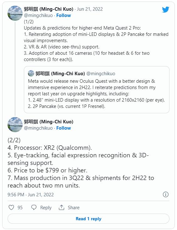 此外,盡管使用的顯示面板分辨率相比Quest 2有所提升,但Brad Lynch曝光的Cambria實(shí)際渲染分辨率(1800×1920)與Quest 2(1832×1920)幾乎一致,高通驍龍XR 2芯片完全能夠勝任,不過因?yàn)槔鋮s的改善以及內(nèi)存加倍(6GB提升到12GB),Cambria所用的高通驍龍XR 2芯片將能夠承受比Quest 2上更高的負(fù)載,也可以算作是一種性能的提升。天風(fēng)證券分析師郭明錤的預(yù)測(cè)也與這一說法能夠相互印證。真正的定制芯片,或許我們?cè)赒uest 3上才能見到。