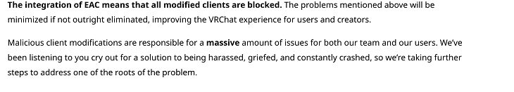 VRChat聲明中寫到加入小藍(lán)熊的理由為,修改(modifications)后的客戶端為VRChat造成了困擾。包括惡意修改后,玩家受到騷擾和攻擊、帶來許多審核問題;用戶信息、成果(Avatar等)被無意識的竊取;修改后產(chǎn)生的BUG對創(chuàng)作者和VRChat本身都造成了巨大的負(fù)擔(dān)。
