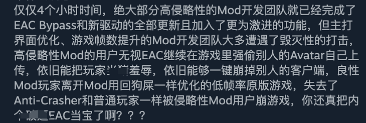 三,禁用MOD只針對老實人。大部分高侵略性的MOD僅用4小時就繞過了EAC的限制,依舊在游戲中大肆侵略玩家的隱私、數(shù)據(jù)等,而真正提升游戲質(zhì)量的好MOD及團隊卻遭到了毀滅性的打擊。