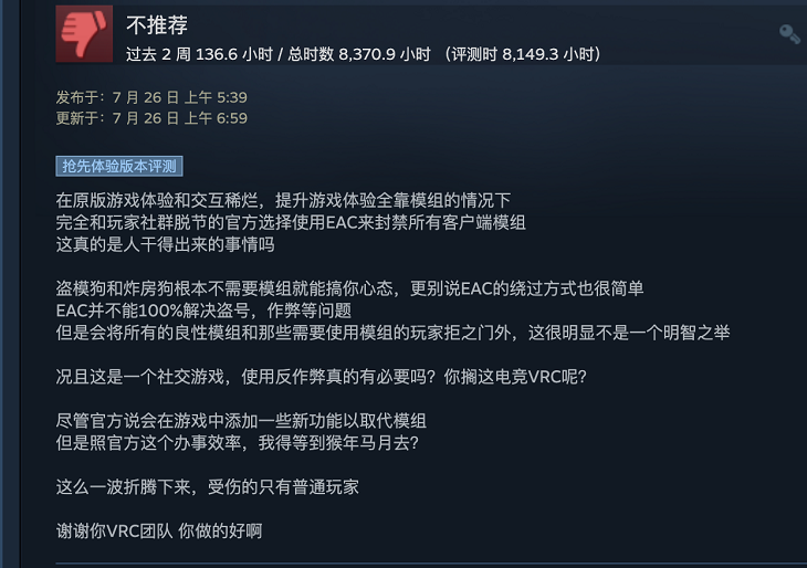 「安全更新」公告發(fā)出之后就立刻遭到了玩家的強烈反對,Steam上只能用罵聲一片來形容。7月25日當(dāng)天,VRChat單Steam平臺就收到了2811條差評,26日差評數(shù)量飆升3倍到了6700余條——幾乎全部都是要求刪除小藍(lán)熊服務(wù)。