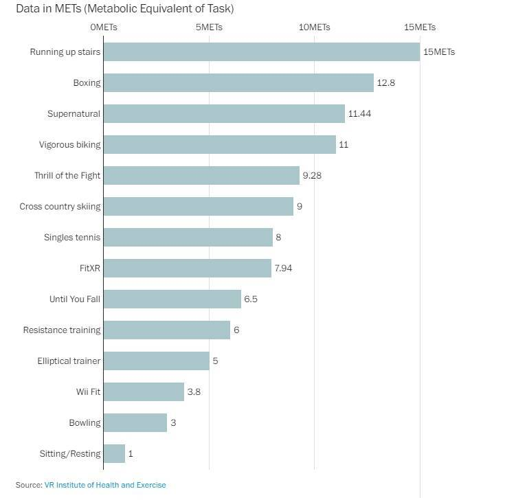 關(guān)于運(yùn)動(dòng)健身領(lǐng)域,根據(jù)虛擬現(xiàn)實(shí)健康與運(yùn)動(dòng)研究所(VRHI)發(fā)現(xiàn),市面上流行的VR健身應(yīng)用強(qiáng)度可以媲美傳統(tǒng)的運(yùn)動(dòng)方式。他們對(duì)一些知名的VR健身游戲做了研究發(fā)現(xiàn),例如《Supernatural》30分鐘的體驗(yàn)代謝當(dāng)量(MET)值與自行車運(yùn)動(dòng)水平相當(dāng)。同時(shí),他們表示,在VR中人們不太容易覺得疲憊。這也從側(cè)面說明,VR健身的方式不僅能成為各種傳統(tǒng)運(yùn)動(dòng)的「平替」,甚至有可能成為新一代的主流健身方式。