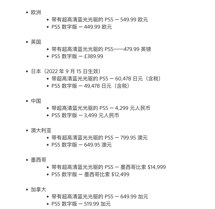 調(diào)整范圍包括:歐洲、中東、非洲、亞太地區(qū)、拉丁美洲、加拿大。也就是說,除了美國之外,其他地區(qū)PS5價格均有上調(diào),漲價策略即日生效。