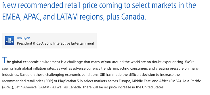 8月25日,索尼CEO Jim Ryan發(fā)布通知稱,由于全球高通脹、貨幣形勢嚴(yán)峻等情況,索尼決定在全球范圍內(nèi)調(diào)整PS5的售價。