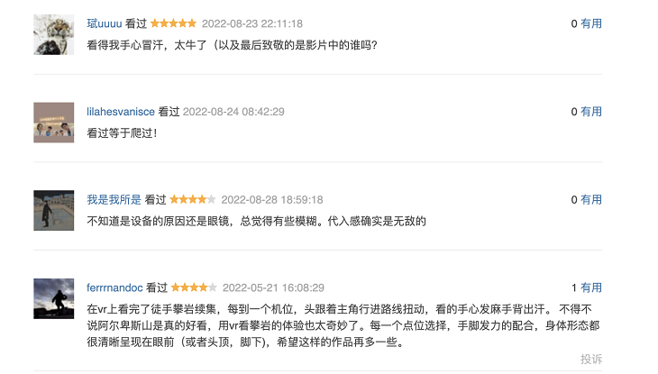 很多人都有一些恐高,而在這樣聳立的山峰上,在VR的沉浸式環(huán)境里,無論是往哪個(gè)方向看,這種恐懼連帶著一躍而下的沖動(dòng)都會(huì)成倍放大。在這種情緒下,觀看一個(gè)沒有任何保護(hù)設(shè)備的人攀爬,耳邊是呼嘯的風(fēng),似乎迎面而來的冷氣會(huì)將人隨時(shí)吹下懸崖,那種刺激的體驗(yàn)是我從未在VR中感受過的。