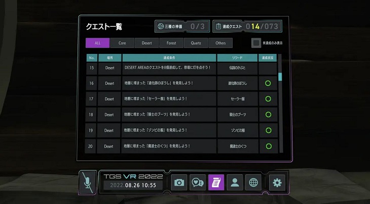 TGSVR2022設(shè)計了專門的任務(wù)與獎勵系統(tǒng),共有70多個不同的任務(wù),包括從游戲PV中獲取最新信息、尋找隱藏物品、與角色對戰(zhàn)、回答測驗等等,讓觀眾在挑戰(zhàn)各種任務(wù)、推進故事情節(jié)發(fā)展的同時享受這場盛大的展會。完成任務(wù)能夠獲得不同的裝備物品以及T恤外觀。