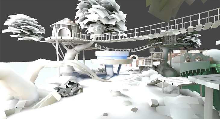 “圓環(huán)方案有很多優(yōu)點,在TGSVR,展覽空間呈圓形排列,參觀者在這一空間中穿行的同時,還能夠欣賞四周的景色。這是只有VR與圓環(huán)式設(shè)計相結(jié)合才能實現(xiàn)的配置,在現(xiàn)實中是做不到的”,參與場館設(shè)計的虛擬建筑師Kanna Bansho表示,“在對圓環(huán)式的VR空間進行概念驗證以及改進的過程中,我們還產(chǎn)生了將空間做成漏斗形狀的想法,為展覽空間做出了不同的高度。這些概念落地后呈現(xiàn)給觀眾的,就是名為GAME FLOAT這個海中的場景”。