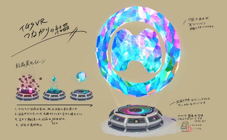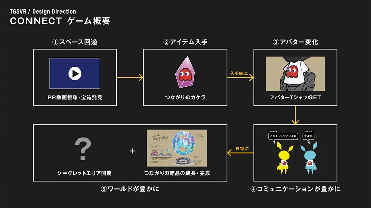 最初,ambr計劃在TGSVR2021中提供觀眾之間進行對抗的射擊游戲系統(tǒng)。但考慮到“展覽才是TGSVR2021”的主角,而且受新冠影響人與人之間的聯(lián)系變得更加困難,游戲機制最終圍繞著“CONNECT(聯(lián)系)”這一主旨,被設(shè)計為鼓勵觀眾在場地中多進行走動以收集“連接水晶”。