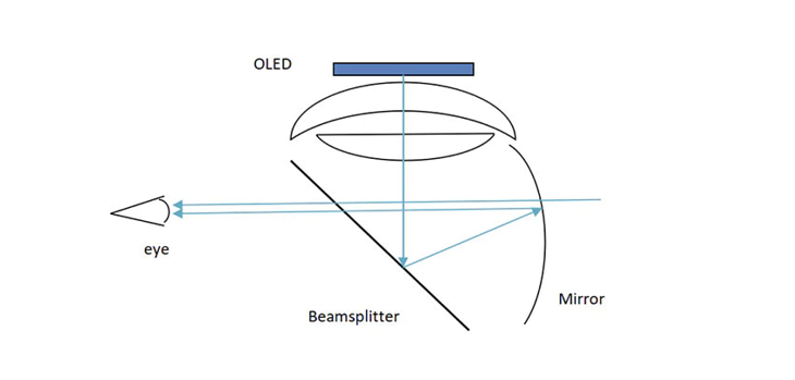 它主要結合包括兩種光學元件,球面鏡和分束器。如上圖所示,BB方案是把來自OLED的光投射到斜著的分數(shù)器中,分束器具有反射(Br)和透射 (Bt)特性,允許光以Br的百分比進行部分反射,分束器返回的光通過凹面鏡重定向到眼睛。BB方案的體積小、而且圖像質量高且支持很寬的FOV。