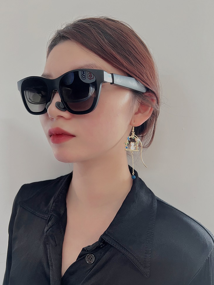 拿到第一眼,Nreal Air確實與普通時尚墨鏡無異,在人群中佩戴也不會有任何違和感,反而時尚的黑色和大鏡框的設計能為大部分人增添一些時尚感。僅重79g(不含線纜和鼻托)的Nreal Air,重量大約相當于一個雞蛋,這個重量還被分攤到耳朵,鼻子等多個部位,戴起來不能說輕若無物,但是比想象中的壓力小很多。