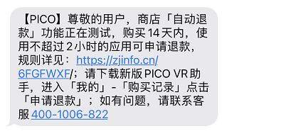 近期可能有不少PICO用戶都收到了一條來自官方的短信,提醒用戶PICO商店正在測試「自動退款」功能:只要購買時間不超過14天并且使用不超過2小時的應用即可申請退款。