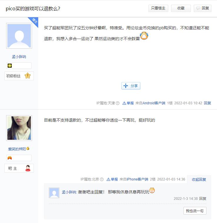 由此,在經(jīng)歷了數(shù)代產(chǎn)品更替之后,PICO用戶終于可以享受方便快捷的退款服務了。此前在PICO貼吧中曾有用戶問及游戲是否能夠退款時,當時吧主給的建議是“適應一下”。