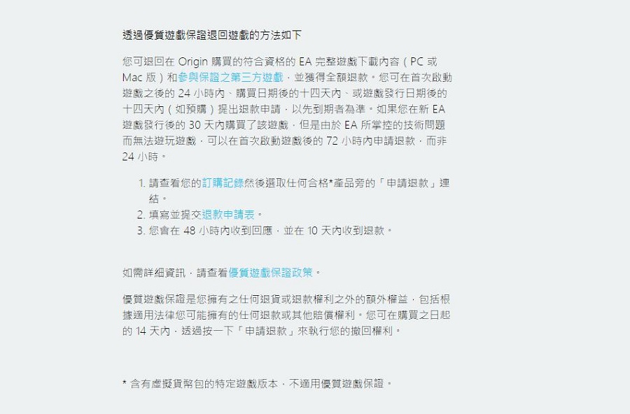 相比之下,EA旗下Origin平臺的退款政策更加寬松一些,根據(jù)平臺的「優(yōu)質(zhì)游戲保證」。玩家可以在首次啟動游戲之后的24小時內(nèi)、購買日期后的14天內(nèi)、或游戲發(fā)行日期后的14天內(nèi)(針對預購)提出退款申請。游戲發(fā)行30天內(nèi)購買,并且遇到EA方面技術(shù)問題無法游戲的,可以在啟動游戲后的72小時內(nèi)申請退款。
