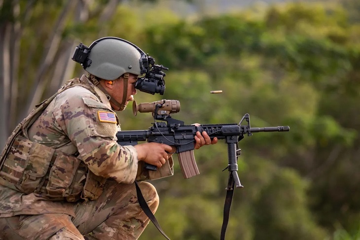 ▲士兵演示如何通過(guò)ENVG-B夜視儀和兼容的步槍瞄具引導(dǎo)瞄準(zhǔn)火力