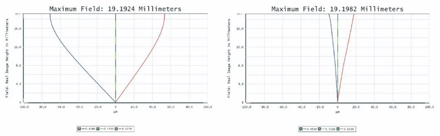 傳統(tǒng)3P Pancake,色散大至 100~200um。歐菲光VR Pancake鏡片設(shè)計采用3P結(jié)構(gòu),并使用低色散材料,使Lateral color縮小至9.9um (<1 pixel),無需經(jīng)過后處理色彩校正,減少整機 CPU 耗能。