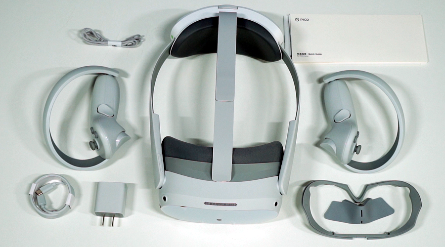經(jīng)過簡單的開箱之后,我們看到包裝盒里的全部物品包含一臺 PICO 4 頭顯、兩個手柄、眼鏡支架、遮光鼻托、手柄掛繩、電源適配器、數(shù)據(jù)線以及說明書等紙質(zhì)文件。這次 PICO 4 無論是頭顯還是手柄,甚至電源和數(shù)據(jù)線全部采用了灰色材質(zhì)。這一方面為產(chǎn)品增加了不少高級感,另一方面也使得 PICO 4 在目前眾多的 VR 產(chǎn)品中擁有不錯的辨識度。