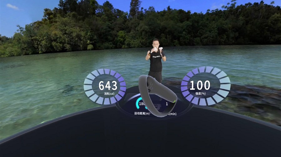接下來我們進行本次評測的重頭戲,那就是體驗各種好玩、有趣的 VR 內(nèi)容應(yīng)用。首先體驗的是一類特別的應(yīng)用,這就是 VR 健身。在一款名為《超燃一刻》的應(yīng)用中,我們可以選擇一系列健身課程,然后跟隨教練的示范開始自己的健身之旅。體驗過程中令人印象最深的就是課程界面會實時顯示用戶消耗的卡路里,而這些數(shù)據(jù)也會同步到 PICO 4 自帶的《運動中心》應(yīng)用,這種即時反饋顯然能夠提高健身者的積極性與信心。