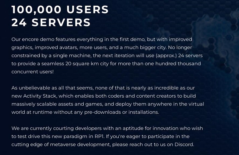 根據(jù)The Immersive Wire簡報(bào),在展示了4000人同時(shí)在線體驗(yàn)之后,RP1準(zhǔn)備更進(jìn)一步,計(jì)劃演示可支持10萬人同時(shí)在線體驗(yàn)的新解決方案。