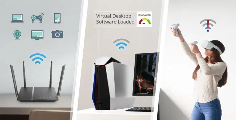 VR Air Bridge通過(guò)Wi-Fi 6連接Quest 2,并通過(guò)USB 3.2 Gen 1連接PC,創(chuàng)建了“高吞吐量和低延遲的專用點(diǎn)對(duì)點(diǎn)Wi-Fi鏈路”,以避免網(wǎng)絡(luò)擁塞和信號(hào)傳播問題。